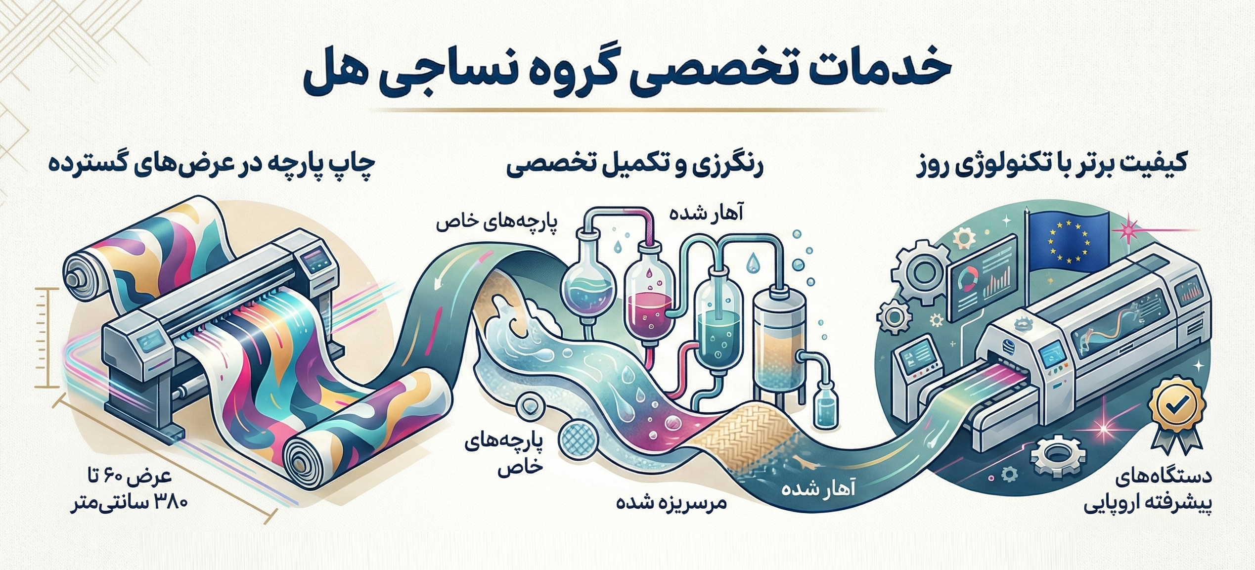 با تخصص در زمینه چاپ پارچههایی با عرض ۶۰ تا ۳۸۰ سانتیمتر، افتخار دارد در حوزه رنگرزی پارچههای خاص، پارچههای آهار شده و پارچههای مرسریزه شده فعالیتی گسترده داشته باشد.